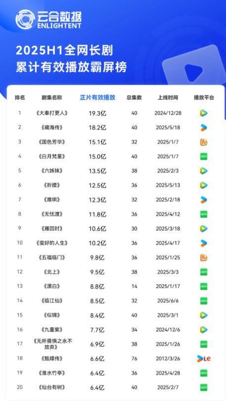 2025年上半年已过程去,诸位读者,你们看哪些电视剧了呢?近日,多个平台齐对上半年播出的电视剧进行统计,而云合数据剧集灵验播放量榜单也进行更新,让公共没念念到的是,《藏海传》仅排第二名,竟不测地被卓越了,这究竟是怎么回事呢?
