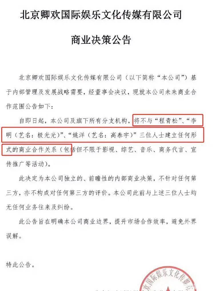 有一家叫“卿欢”的文娱公司,公开晓谕和“3东说念主”切割联系,不会树立任何面貌的商务合作联系,包括但不限于影视、综艺、音乐、商务代言、宣传算作等等。
