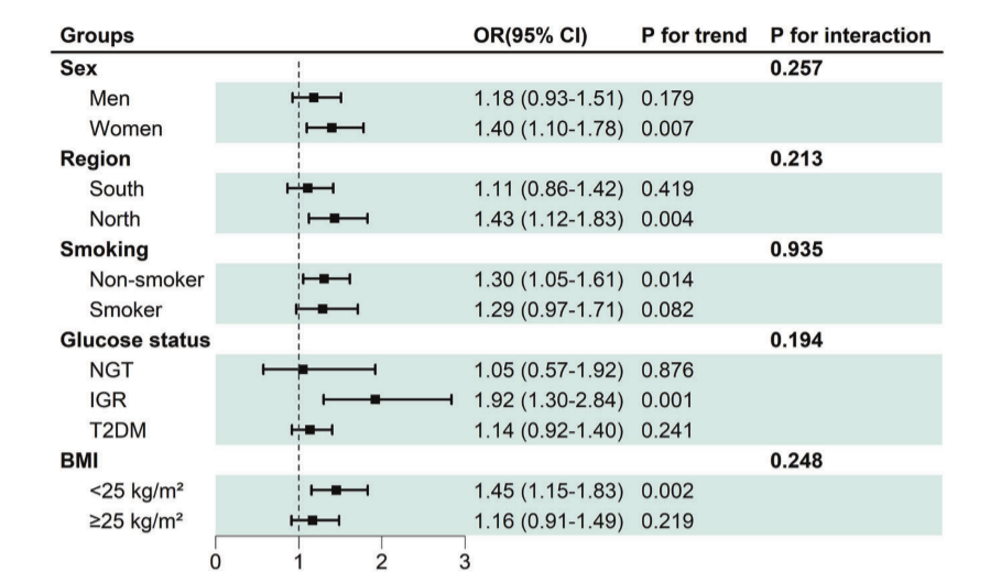 ✔分组分析探讨MASLD的危急要素:女性(趋势P=0.007)、非抽烟者(趋势P=0.014)、朔方住户(趋势P=0.004)、患有糖改变受损(IGR)的参与者(趋势P=0.001)和体重指数小于25kg/m2(趋势P=0.002)中,快速进食频率与MASLD风险之间存在零丁关联。